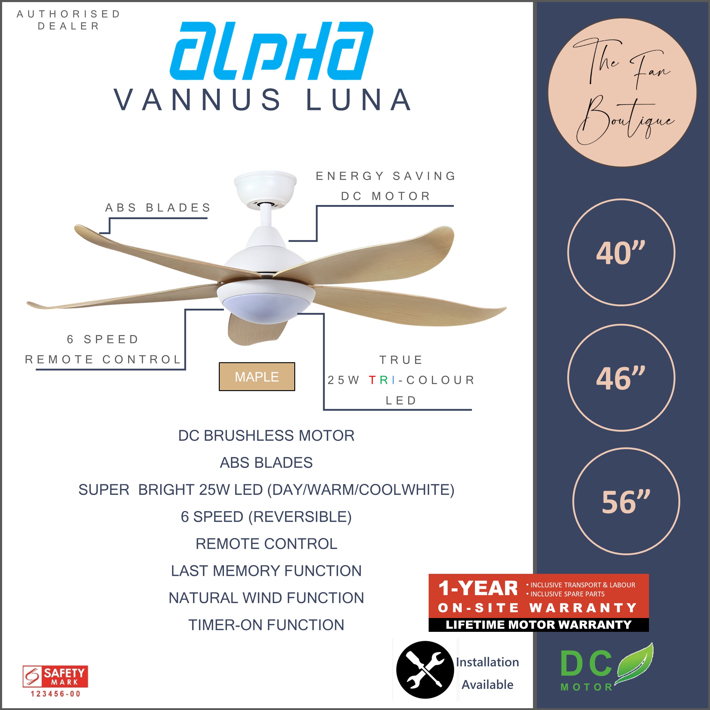 ALPHA Vannus Luna 46" DC Motor Ceiling Fan with 25w LED Light and Remote Control