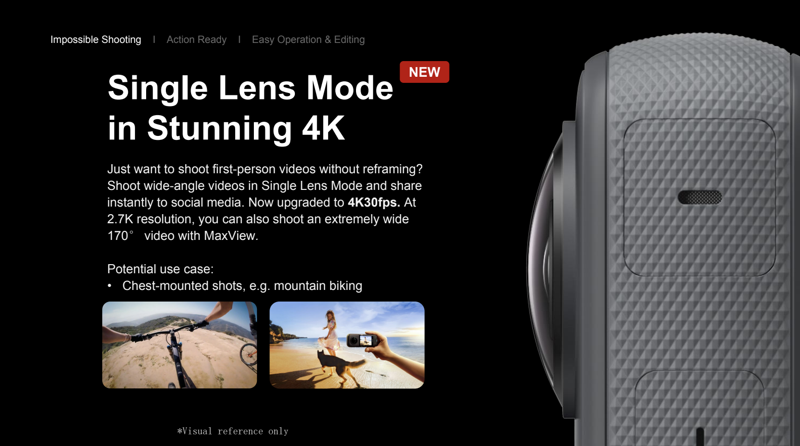 When you’ve got a clear vision for your content that only requires one point of view, Single-Lens Mode can’t be beat. Now upgraded to 4K resolution, this mode is perfect for immersive first-person views of the action, especially chest-mounted shots. A new extremely wide 170° MaxView is also available at 2.7K for even more immersive POVs.