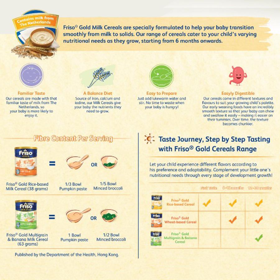 As you wean your baby, they are likely to eat less until they become more familiar with solid food. Friso Gold rice-based milk cereals are rich in important nutrients to ensure your baby has a balanced diet. They are also made with milk powder so they taste more familiar to your baby. The smooth texture eases their first step into eating solids and is easier for little tummies to digest. It’s easy for you too because Friso Gold cereals are prepared the same way as Friso Gold formula – just add water.
