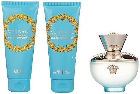 Versace Dylan Turquoise 4pc Gift Set For Woman - 3.4oz Dylan Perfume Edt Sp + 3.4oz Body Gel + 3.4oz Shower Gel + Pouch